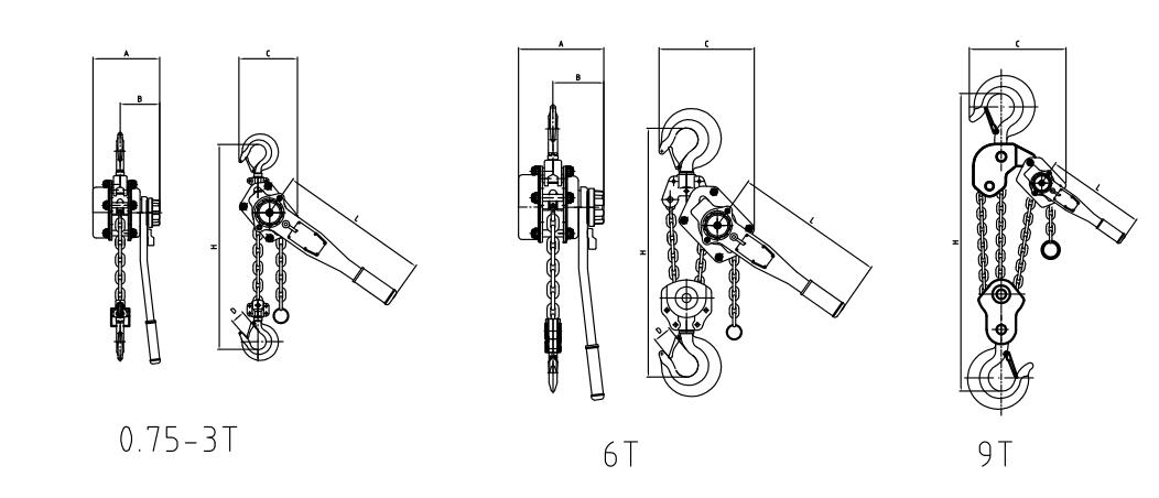 型號 | 額定載荷(t) | 起升高度(m) | 試驗載荷(t) | 手板力 kg(n)(ibs) | 起重鏈條 | 尺寸規格(mm) | 重量 | ||||||